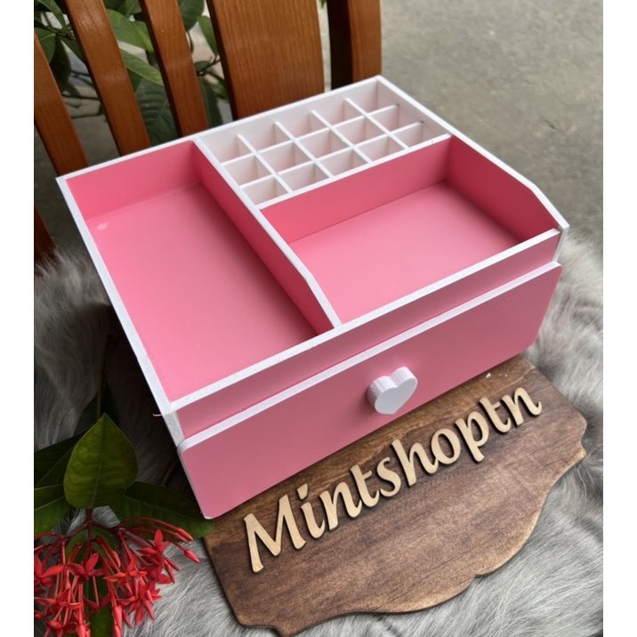 Kệ đựng mỹ phẩm 25cm là sản phẩm tiện ích lý tưởng để đựng các sản phẩm trang điểm, với kích thước dài 25cm, rộng 20cm và cao 12cm. Sản phẩm được gia công bởi Mintshoptn và thiết kế tinh tế, phù hợp với không gian hiện đại.